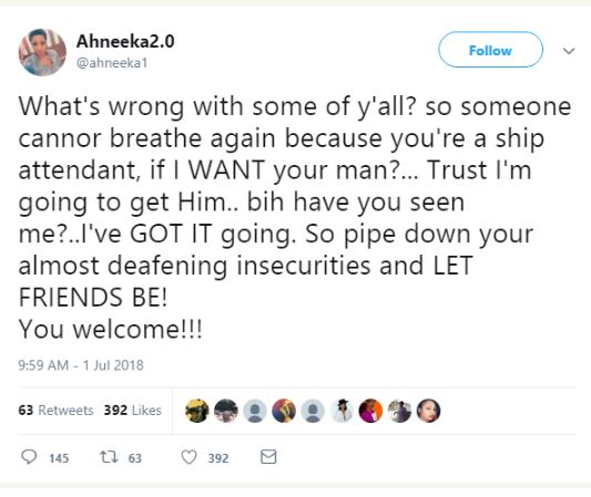 Ahneeka tweeted; "What's wrong with some of y'all? so someone cannor breathe again because you're a ship attendant, if I WANT your man?... Trust I'm going to get Him.. bih have you seen me?..I've GOT IT going. So pipe down your almost deafening insecurities and LET FRIENDS BE!